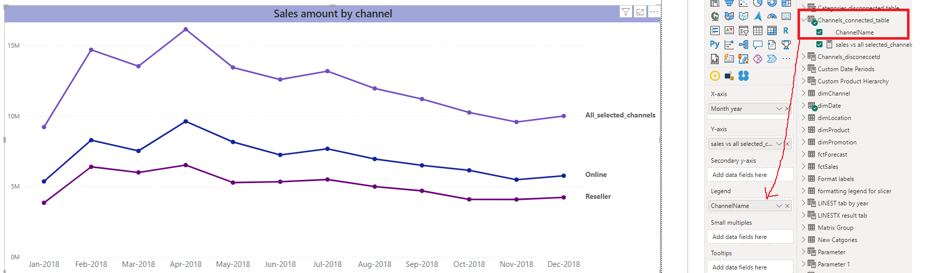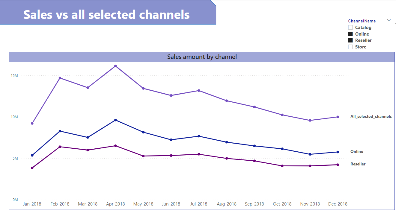 In this example, if we select the βOnlineβ and βResellerβ channels, the line chart will display a separate line for each of them + a line for their totals.