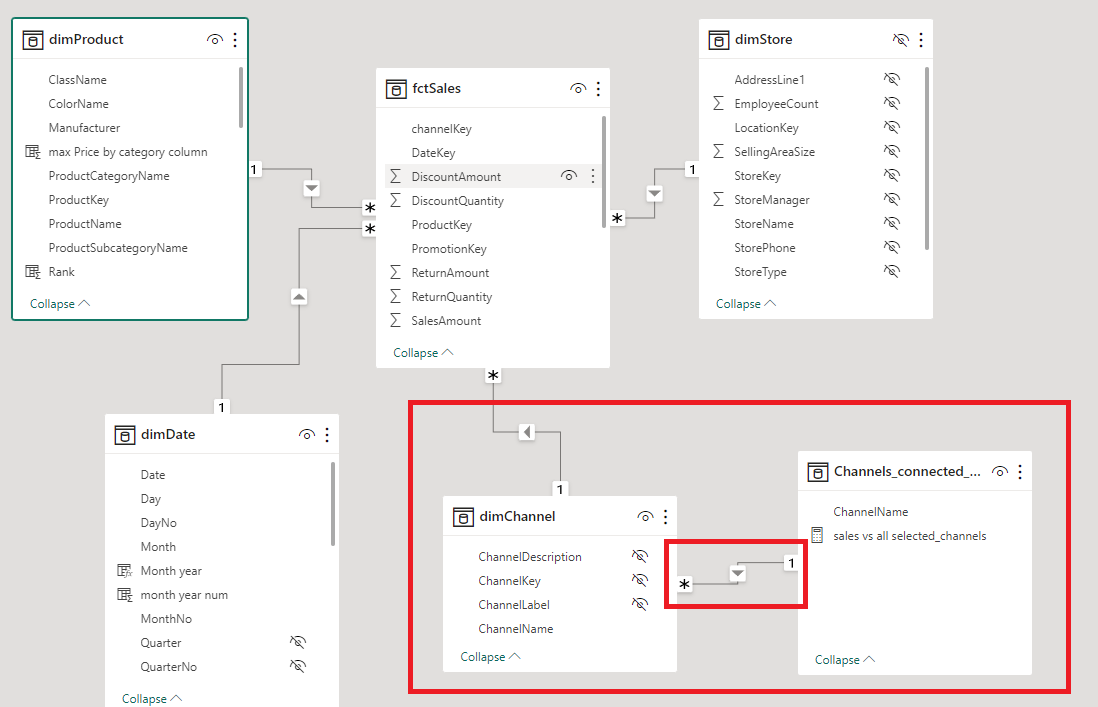For each channel value in the "channels_connected_table", the DAX measure will calculate the amount of sales based on the channel selected from the slicer of the dimension table, and for the "All_selected_channels" value, it will calculate the total sales amount for all selected channels items .