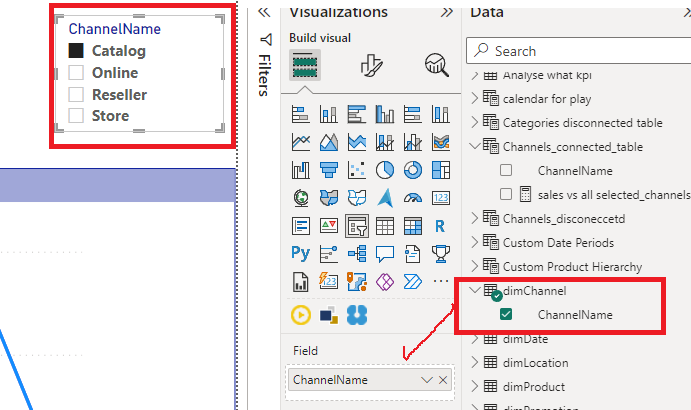 Add a slicer that will contain the channels from the dimension table βdimChannelβ